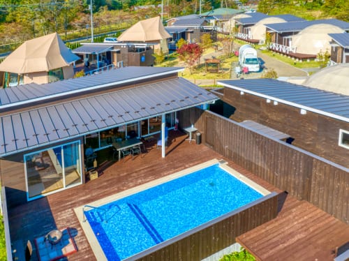 “GLAMP DOME Fuji Oshino” is a glamping facility located right next to a clear stream at the foot of Mt. Fuji. All guest rooms come with hot springs, and we offer glamping BBQs where you can savor Yamanashi wine and Koshu beef. Experience glamping in Fuji Oshino, known as the village of clear waters.